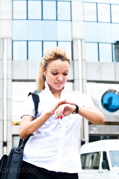 Красивая молодая бизнес-леди смотрит на наручные часы