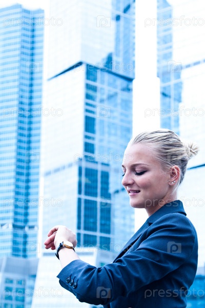 Красивая молодая бизнес-леди смотрит на наручные часы