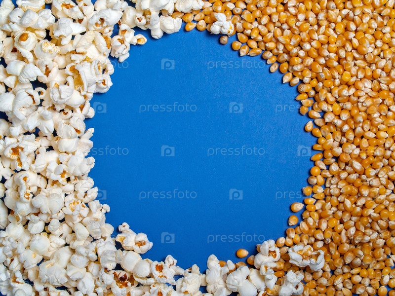 Фон готового попкорна и кукурузных зерен на синем фоне