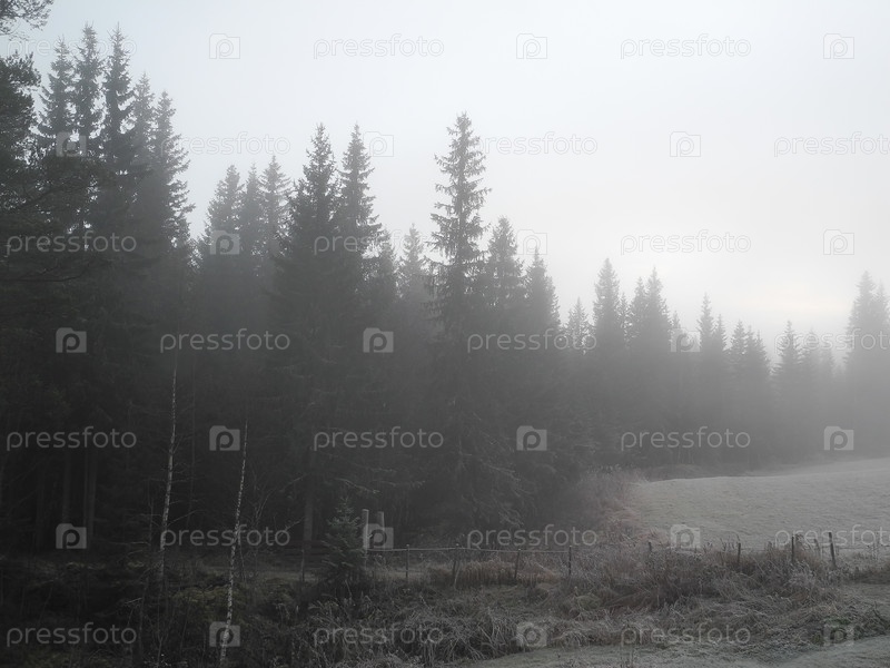 Туманное утро в сельской местности с инеем на земле
