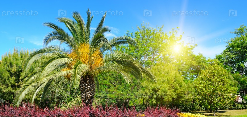 Летний парк с тропическими пальмами, цветниками и солнцем