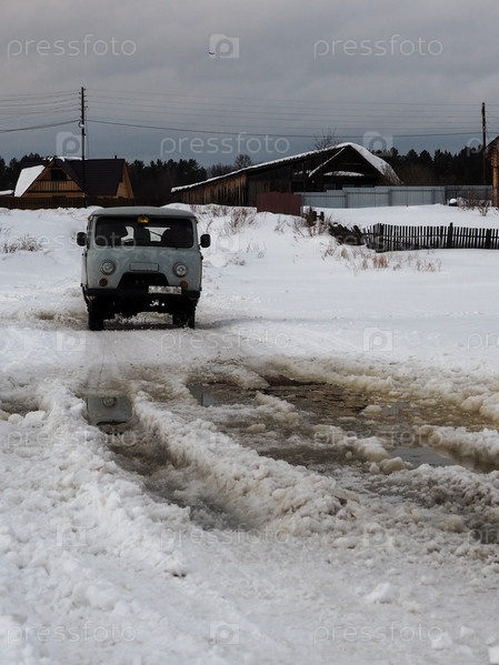 Серый УАЗ пересекает реку Чусовая по ледовой переправе