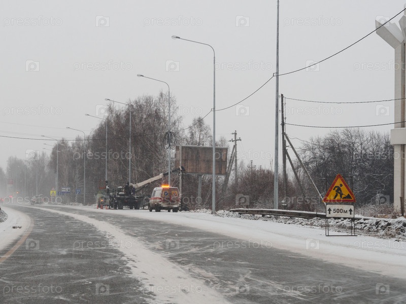 Дорожные службы работают на обочине трассы