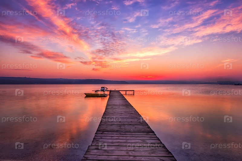 Захватывающий закат на берегу с деревянным причалом