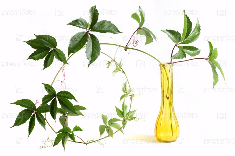 Девичий виноград в желтой вазе на белом фоне