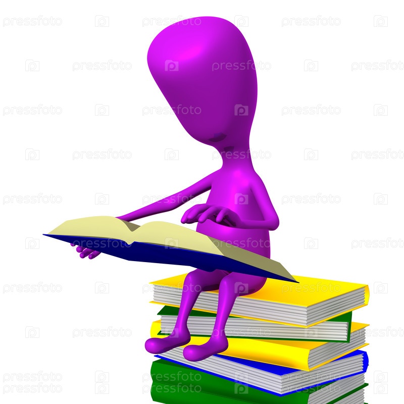 Человечек читает книгу, сидя на стопке книг