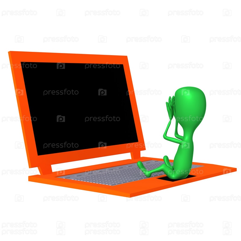 Кукла закрыла глаза, сидя перед ноутбуком