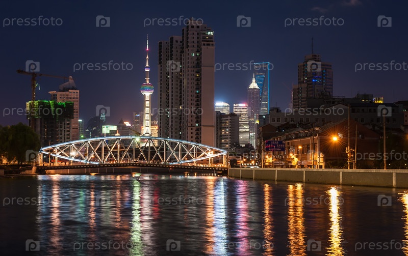 Шанхай, Китай: мост и река с большим количеством огней ночью