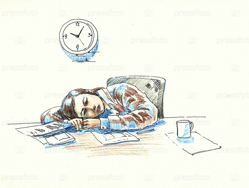 Долго работающая женщина на работе в офисе, карандашный рисунок