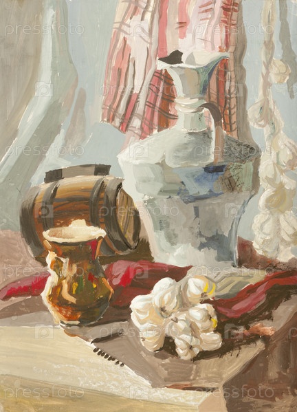 Натюрморт с чесноком, бочонком и кружкой пива, рисунок гуашью