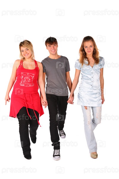 Молодой человек и две девушки шагают вперед, изолированные на белом фоне