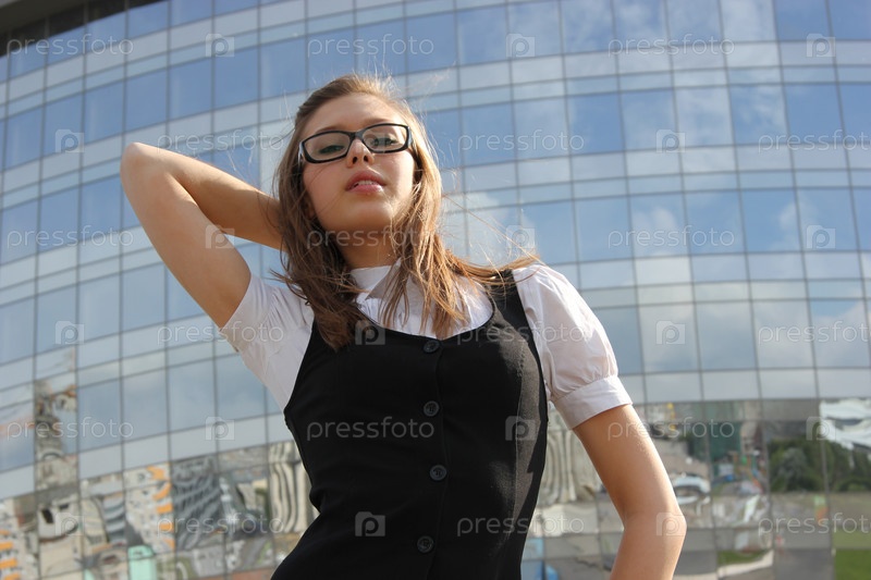 Девушка на фоне офисного здания