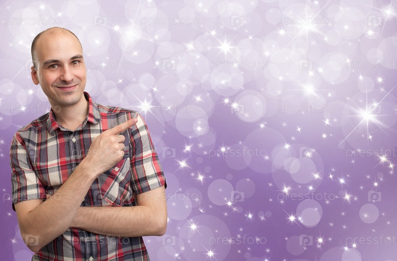Мужчина указывает пальцем на Рождественский фон