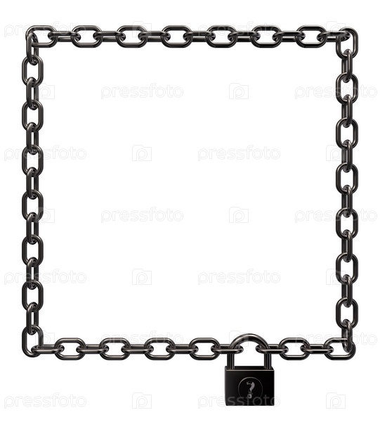 Замок на раме из металлической цепи на белом фоне. 3d иллюстрация