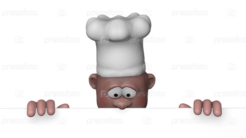 Мультипликационный шеф-повар с пустым белым баннером. 3d иллюстрация