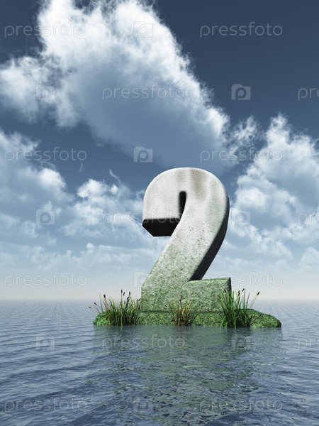 Каменная цифра два в океане. 3D иллюстрация