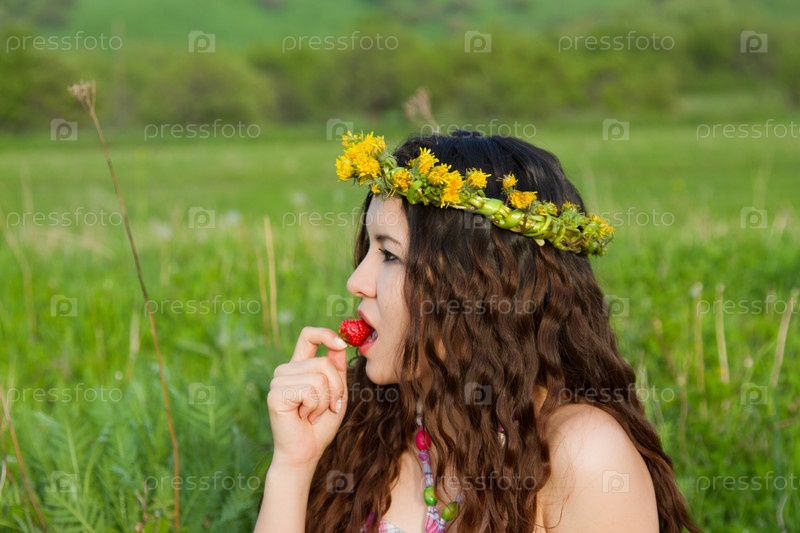 Красивая женщина в венке на траве