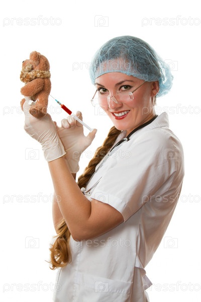 Врач или медсестра делает инъекцию плюшевому мишке