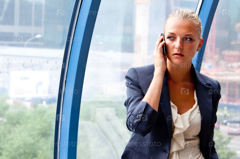 Молодая и красивая деловая женщина говорит по телефону