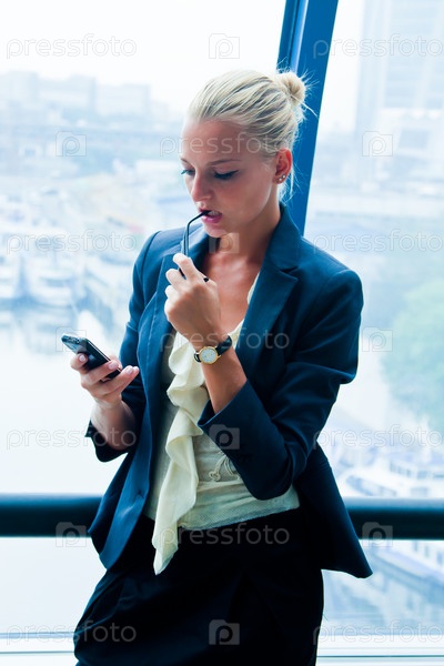 Молодая и красивая деловая женщина читает смс-сообщение на мобильном телефоне