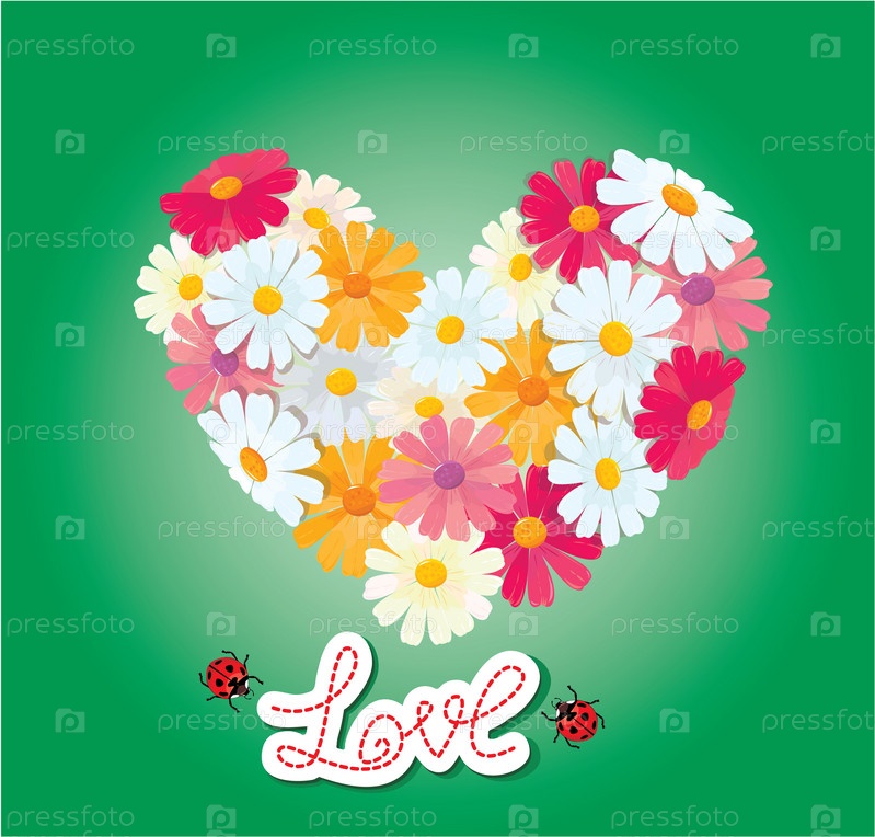 Сердце из ромашек на зеленом фоне. День Святого Валентина