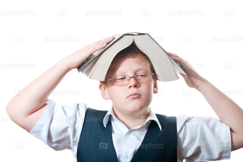 Задумчивый мальчик с книгой на голове