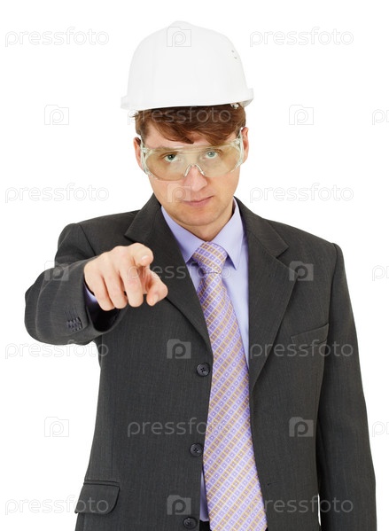 Эксперт по технике безопасности, строго показывает пальцем, на белом фоне
