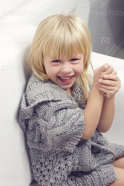 Трехлетняя девочка в сером вязаном свитере