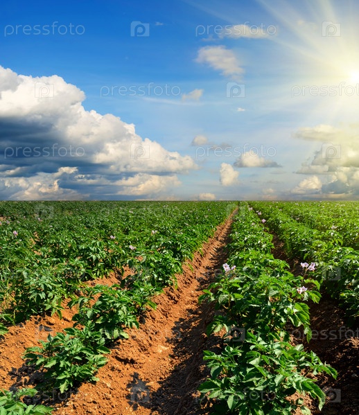 Поле картофеля на закате под голубым небом