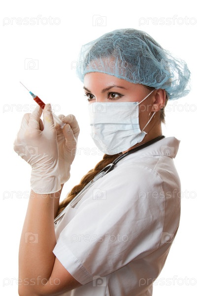 Женщина-врач или медсестра со шприцем, изолированная на белом фоне