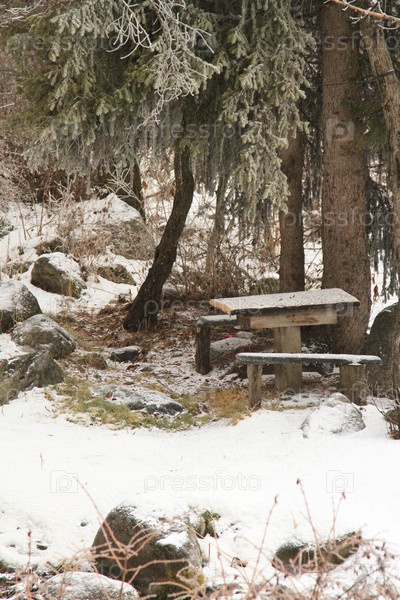 Стол и скамейки вдля пикника в снегу красивой зимой в Казахстане, Алматы