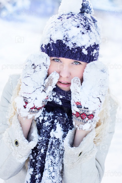 Красивая женщина в теплой одежде в снегу