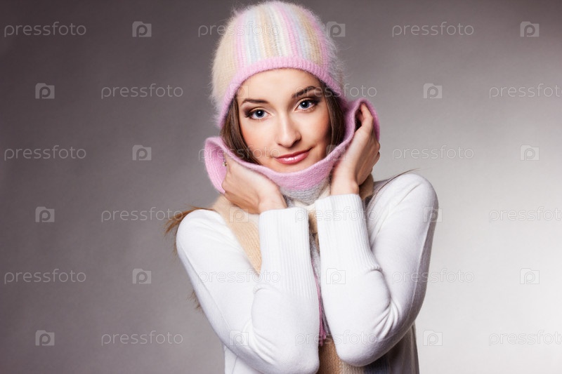 Красивая женщина в теплой одежде на сером фоне