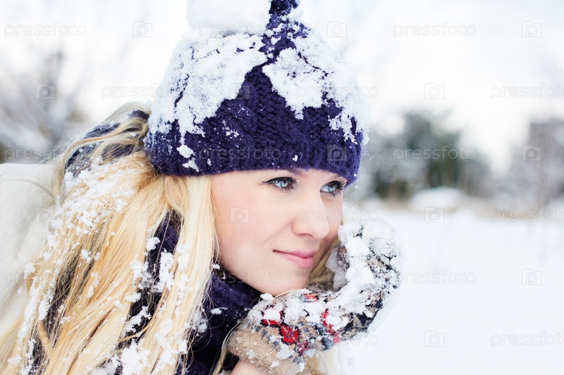 Красивая женщина в теплой одежде в снегу