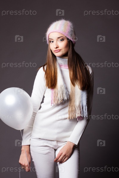 Красивая женщина в теплой одежде на сером фоне