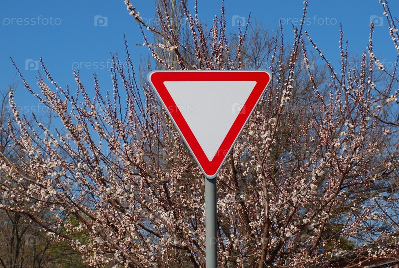 Знак "Уступите дорогу" на фоне цветущего дерева