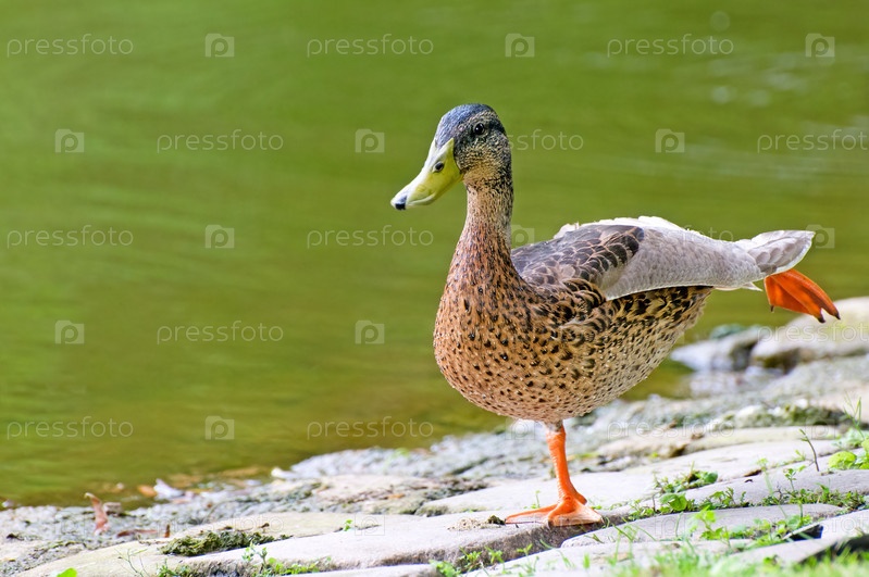 Домашняя утка на фоне пруда