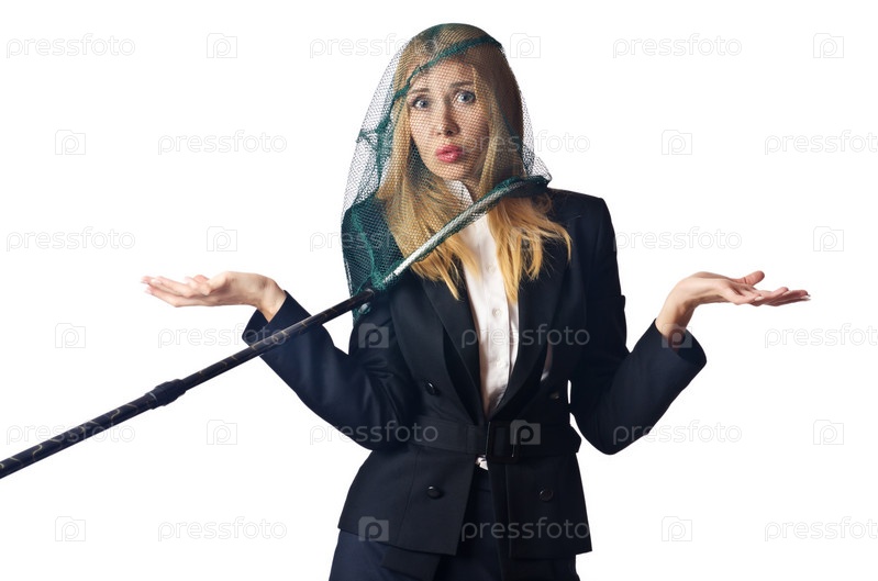 Женщина с сачком, изолированная на белом фоне