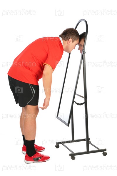 Человек смотрит на себя в отражение в зеркале