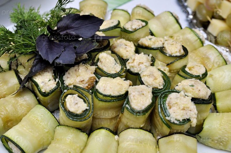 Закуска, роллы с огурцом, укропом и базиликом