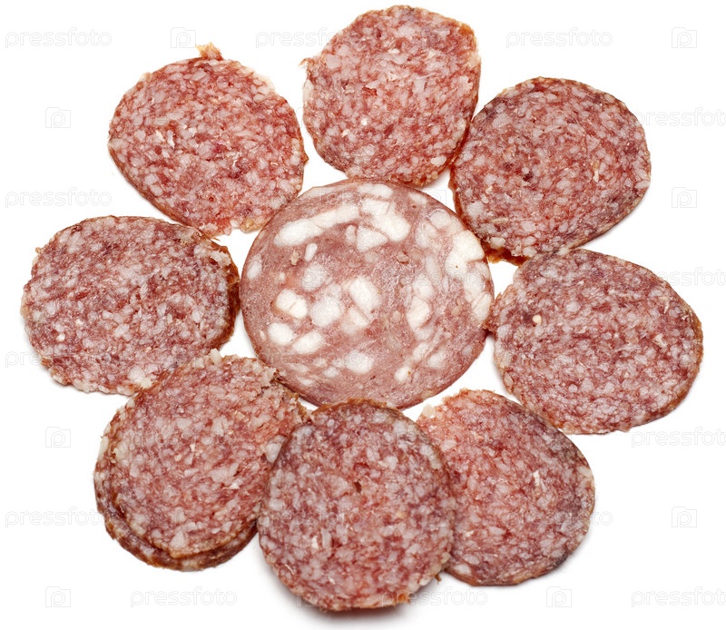 Колбасные ломтики выложены в рисунок на белом фоне