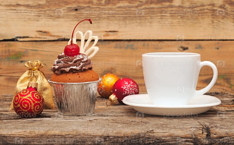 Шоколадно-вишневый кекс на старых деревянных досках. Рождественский завтрак