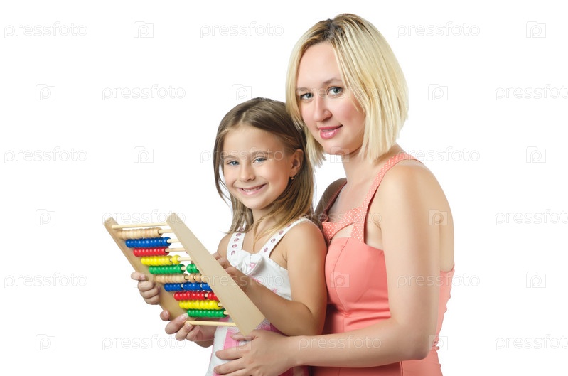 Счастливые мать и дочь на белом фоне