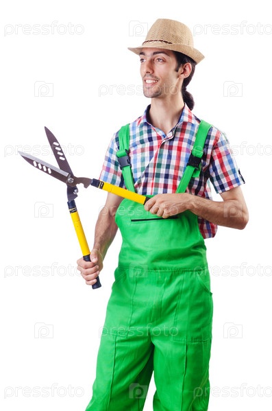 Садовник с ножницами на белом фоне