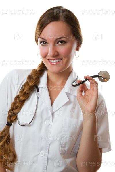 Улыбающаяся женщина-врач или медсестра в белой униформе со стетоскопом, изолированная на белом фоне