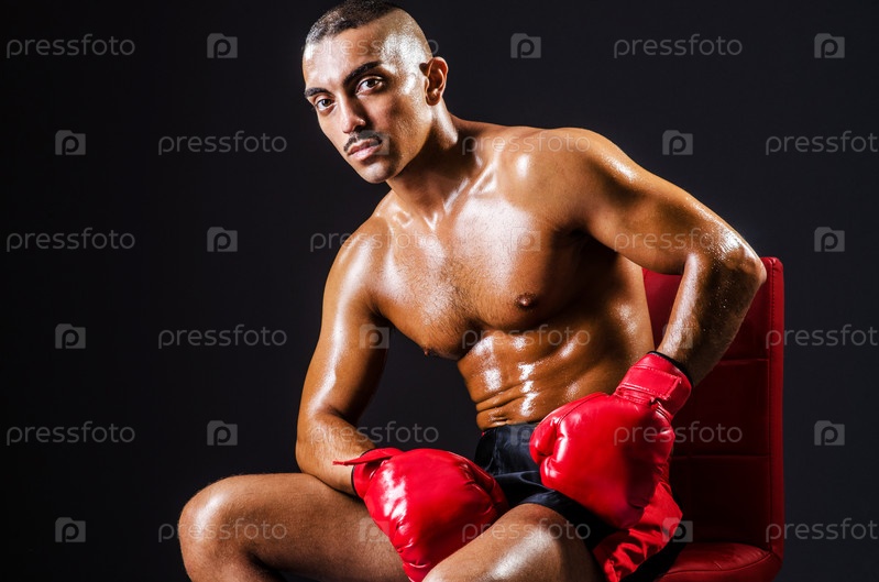 Боксер в красных перчатках в темной комнате
