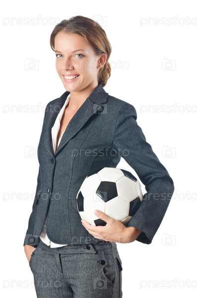 Бизнес-леди с футбольным мячом на белом фоне