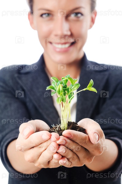Бизнес-леди с рассадой на белом фоне