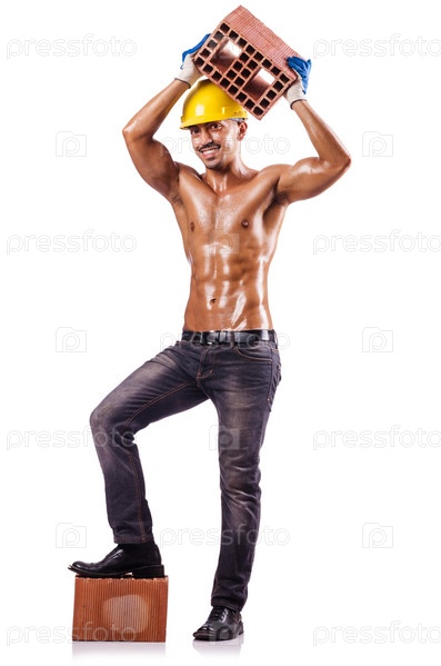 Мускулистый строитель с кирпичами на белом фоне