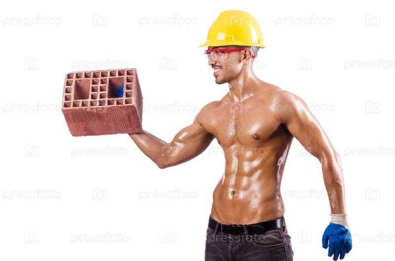 Мускулистый строитель с кирпичом на белом фоне